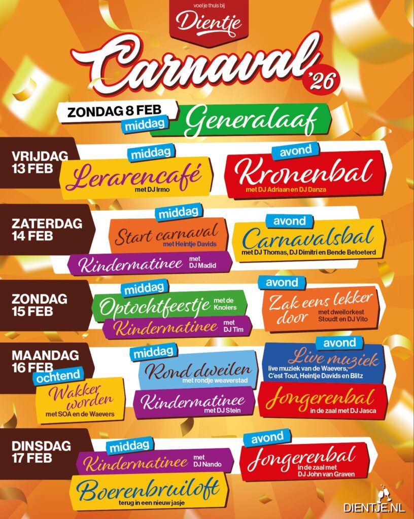 Wie heeft er nog nooit Carnaval bij Dientje gevierd? Dat kunnen nooit veel mensen zijn... Sinds jaren is Dientje, bijvoorbeeld met het Kronenbal op de vrijdagavond, de plek om 'het feest der feesten' te vieren!